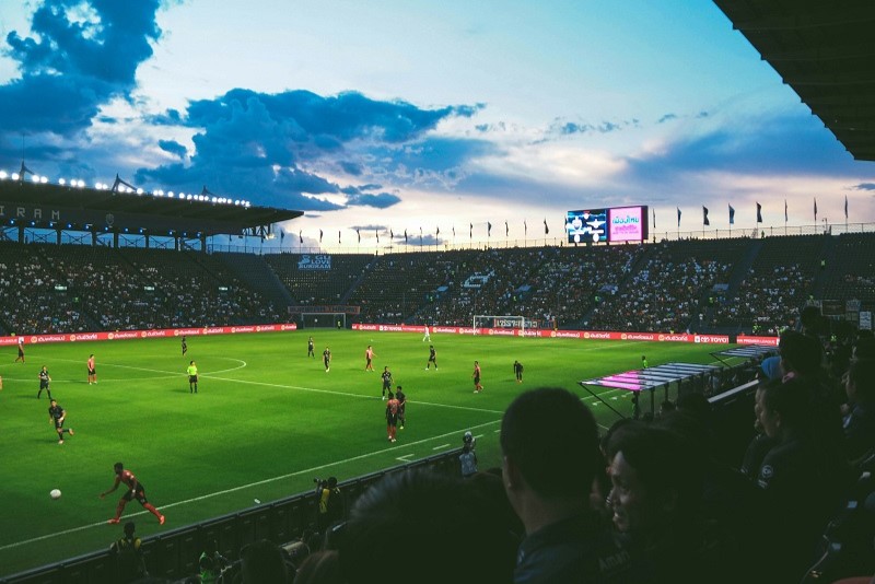 A soccer game is taking place in a stadium. There are many people in the stands watching the game. The players are on the field with a green grassy surface. The sky is a beautiful blue and pink. There are many flags hanging around the stadium.